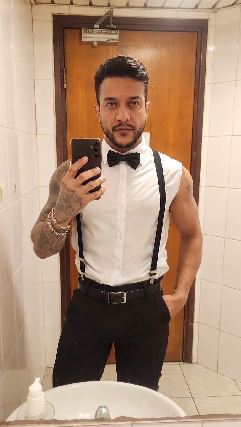 Brazilian companion temporarily in Hong Kong | Tanned, short beard, tattooed, naturally charming.