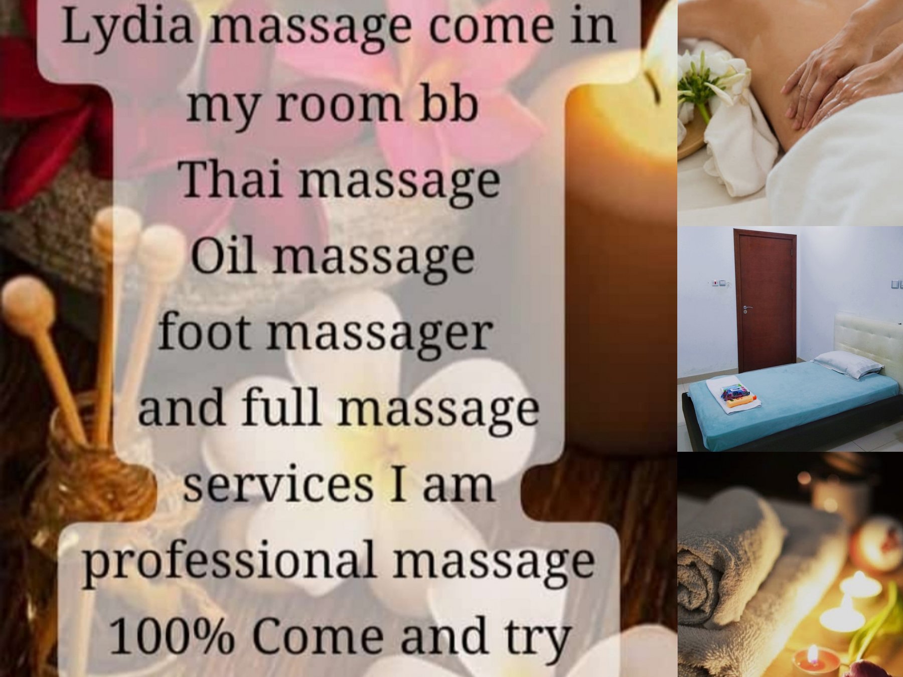 Me have room safety for you and clean and quiet, with soft music for you to relax and it is a relaxing time for you.I have a body massage and a bath for you.Great service and a great massage for you! π